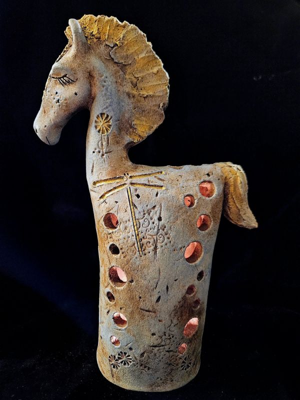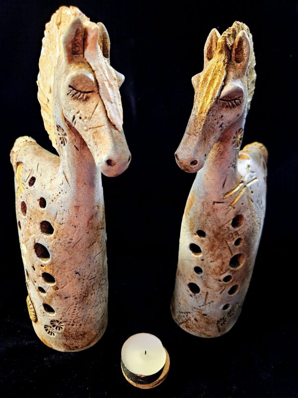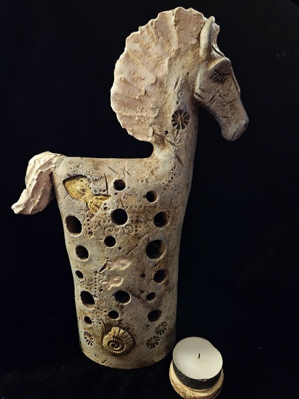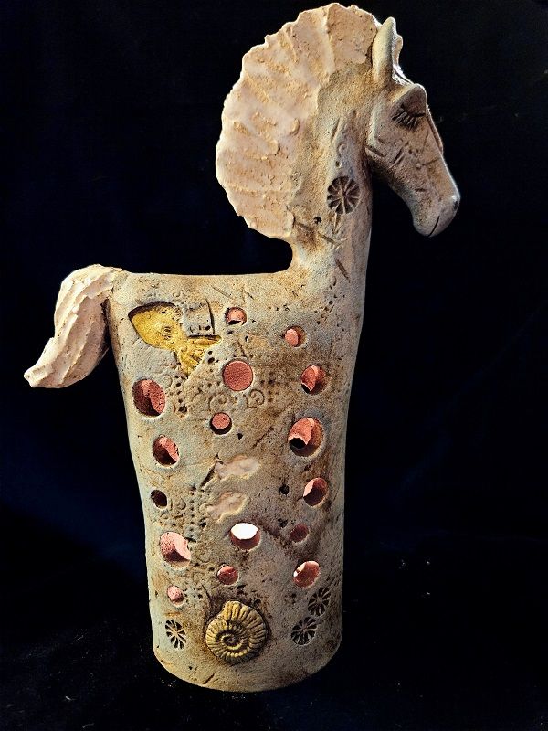 Ručně modelovaná keramická socha ( svícen) z šamotu . Včetně podložky na svíčku. Výška cca 27 cm . Páleno na vysokou teplotu, může být celoročně venku.