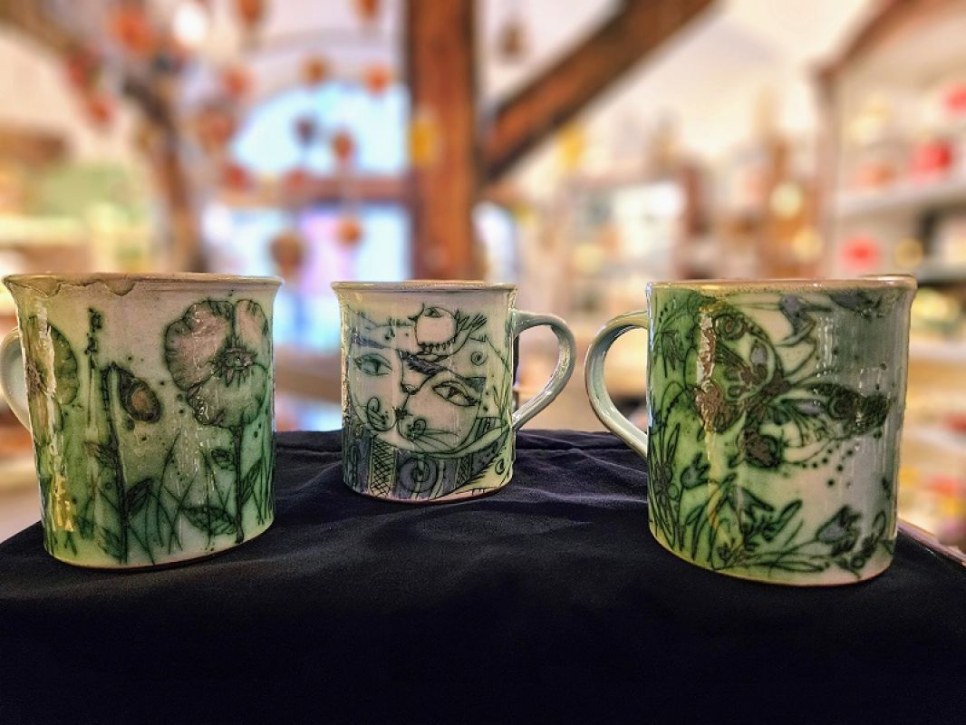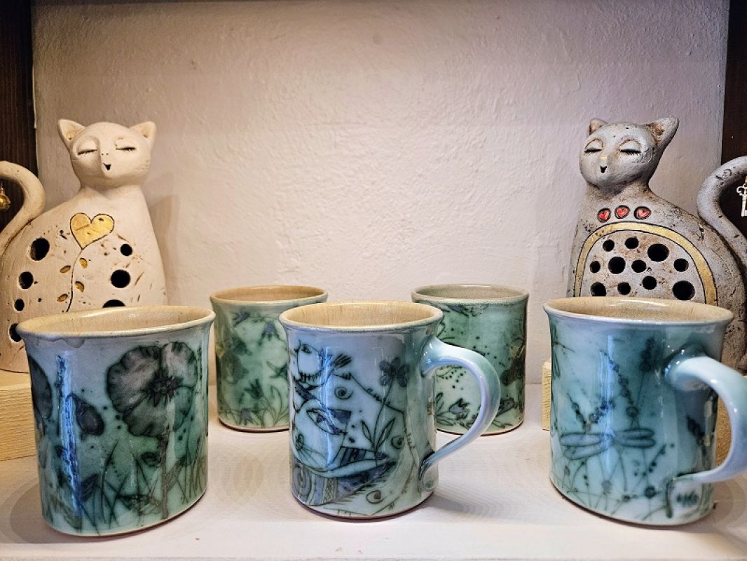 Die Keramiken werden auf der Töpferscheibe gefertigt oder frei modelliert. Sie sind mit feinen Gravuren verziert, die durch Türkis-, Tiefblau-, Dunkelgrün- und Brauntöne ergänzt und hervorgehoben werden. Alle Becher sind handbemalt und somit Unikate. Jedes Stück ist ein Unikat. Alle Gebrauchsgegenstände verfügen über Zertifikate, die den europäischen Normen entsprechen.