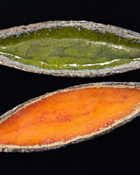 As if discovered on a mysterious archeological site.  These delicate small eggshell bowls have a texture and internal glazing that is original and delightful to behold.  They are very tactile with their rough crackled exterioir and smooth and brightly coloured interior.  Where both treatments meet at the bowls edge gives each eggshell it's jewel and otherworldly appearance.