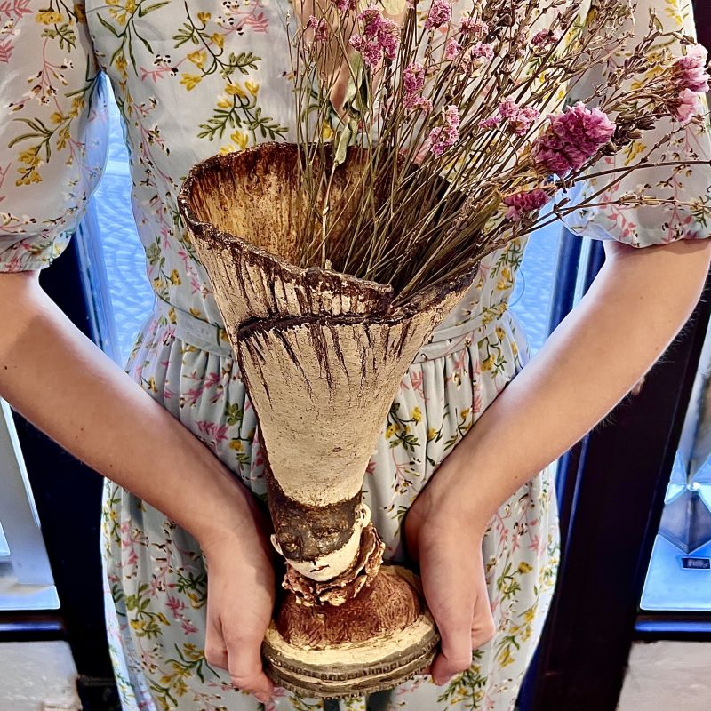 What a romantic chap he is.  With his unique finish he looks like he belongs at a masquerade ball.  The combination of finishes, raw and glazed add a delcateness which adds to its charm and also helps compliment flowers giving an unusual angle for your floral display.  A truly original design which will adorn any surface and bring a little more magic and mystery to your world.